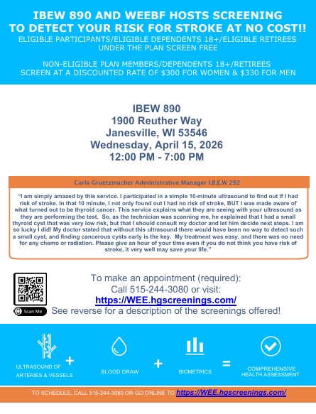 IBEW Local 890 will once again be hosting the Health Gauge Screening at the hall….